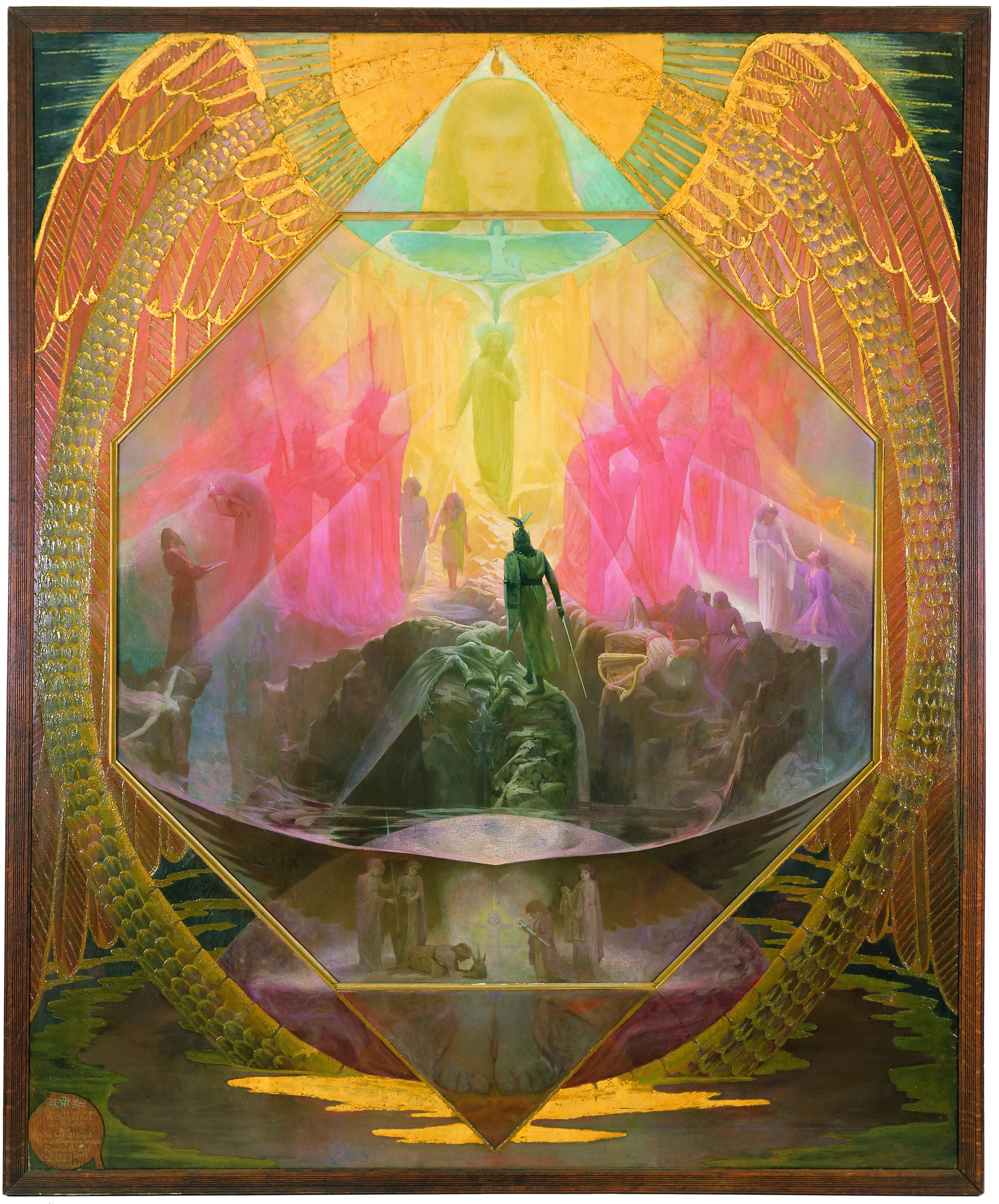 This symbolic painting hangs in the administration building at the International Headquarters of The Theosophical Society, Pasadena, California. It is in oil and gesso, measuring 6'2" x 7'5". In the artist's words, "THE PATH is the way by which the human soul must pass in its evolution to full spiritual self-consciousness."