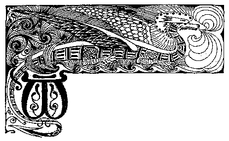 Thereupon he turned towards the lake, and sounded the hai atton of the men of the Bargod upon his horn; and having sounded it came down out of his chariot. Nine stern, tall, princely warriors rose up out of the lake, and came forward. They were equal in strength and beauty, and in richness of dress and armor, to their lord the penteulu. The dullest of their ten horned helmets glowed like the crimson setting sun. The poorest of their glimmering, pearl-pale mantles was embroidered with a ruby-colored, rose-rich dragon. The least of their keen, silver-headed spears would have been capable of victories on the confines of hell. Courteously they greeted Gwri; courteously in return he greeted them.