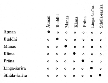 The following diagram represents the unfolding of the sevenfold entity from the highest, or pure spirit. In the case of either a universe or a human being the other six principles arise from the first and hang like pendant jewels from the first. In other words, out of the divine or out of spirit is born all that is, in a galaxy, in a solar system, in a planet, in a man.