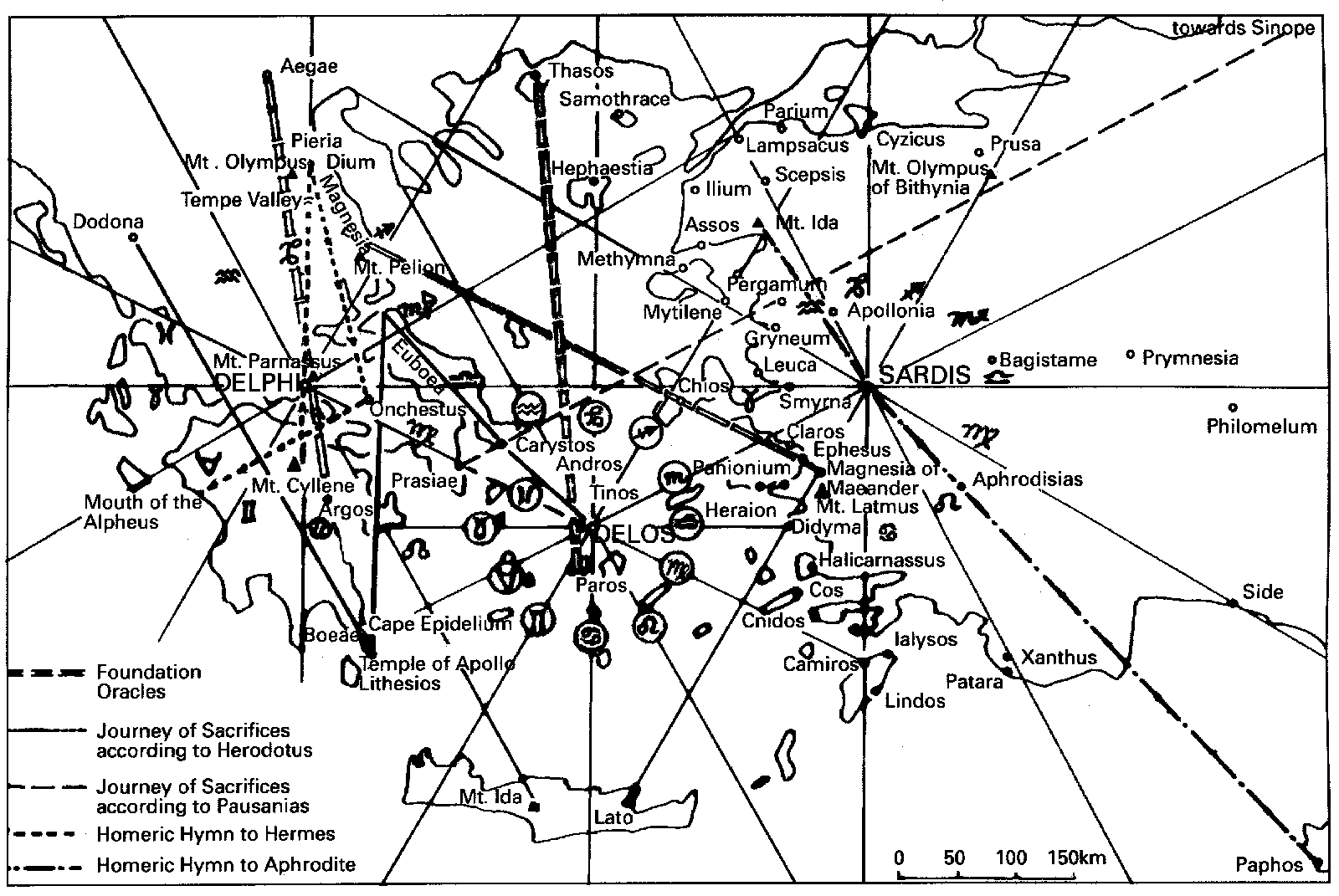 Further investigation revealed a second zodiacal wheel centered on Delos, which furnished the Aegean islands with sacred celestial directions and correspondences; and a third, older wheel centered on Sardis, capital of Lydia (in present-day Turkey), a city on the same latitude as Delphi (see Map 1). Finally, he found a still more ancient system centered on Ammoneion in the Libyan desert, home of the oracle of Ammon. It shared the north-south axis or pole line with Delos and included such objects as the Sphinx at Gizeh in its sectors.