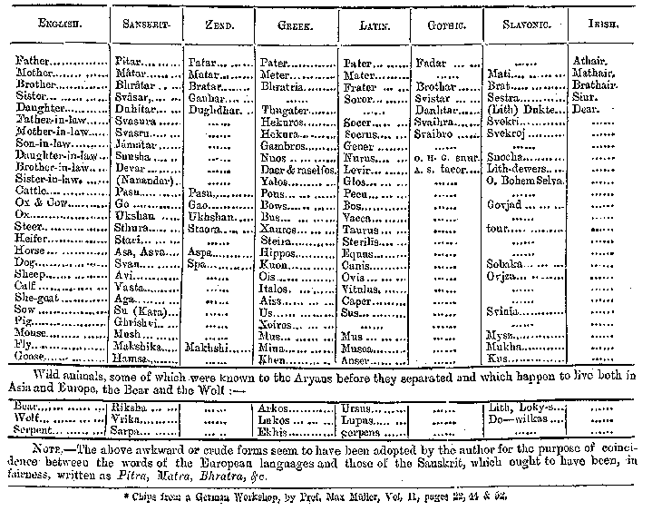 The very corrupt forms, as diverse as are the languages in which these words stand, as the above table shows, and the absence of a legion of other Sanskrit words in the European languages, which are formed mostly of terms of peculiar European origin and formation, neither approaching nor bearing affinity to the Sanskrit words even in roots and derivatives, are tangible evidences going in perfect harmony with what I say.