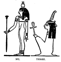 Seb was styled the "Father of the gods," and Nit or Nutpe, his consort, bore the titles of "mother of the gods," and "protectress of souls." This goddess was sometimes depicted with the figure of a vulture upon her head, to symbolize her character as the Great Mother; also standing in a tree with a jar from which she poured water which a soul beneath the tree caught with the hands. As Seb was lord of the earth, so she was the queen or personification of the vault of Heaven. (12)